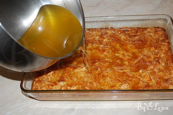 Remove from the oven and pour the syrup we prepared at step 1 right away, while the cake is very hot.