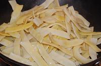 When the beans are nearly cooked, heat a deep pan thoroughly. Add half a glass of water, one tablespoon of oil, and sliced green onions. Cook until most of the water evaporates and the onions are tender.