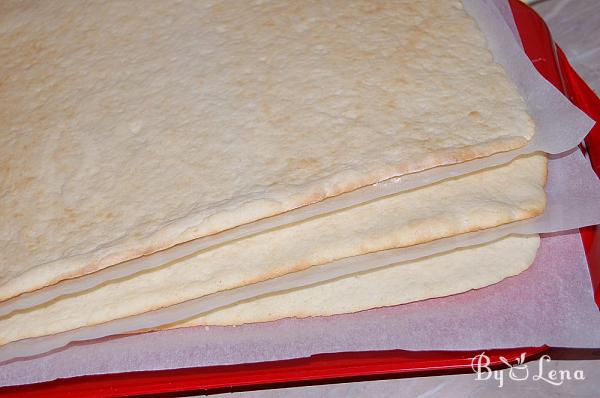 Assemble the cake by layering: sheet 1 + cream + sheet 2 + cream + sheet 3.