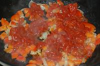 After the onions and pepper have softened, add the diced tomatoes (here I used canned).