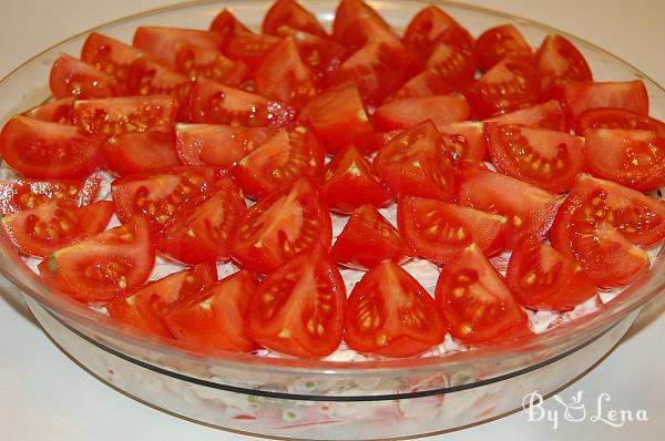 Arrange tomato slices on top for a decorative finish. Cherry tomatoes work beautifully, but diced regular tomatoes are also suitable.