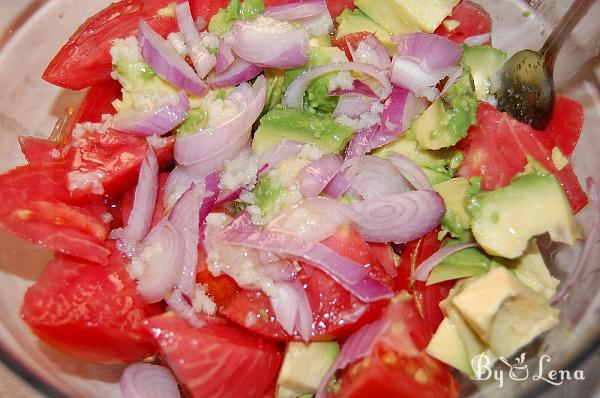 Slice the red onion into thin juliennes and toss them with the diced tomatoes and avocado.