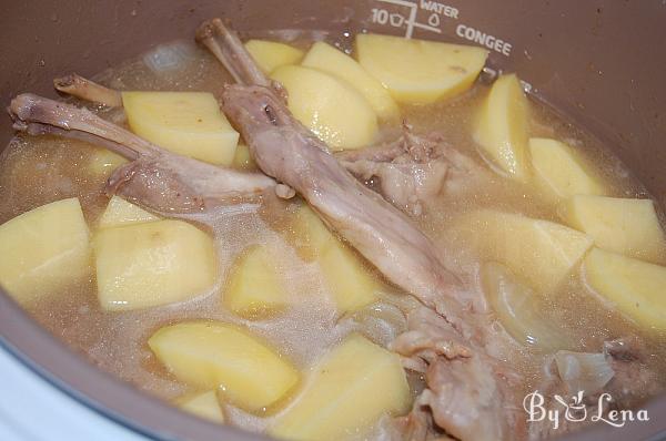 Add enough water to fully cover the meat. Bring it to a boil on high heat, then reduce to low heat and let the meat simmer. This can take from 1 to 3 hours, depending on the age of the rabbit meat.