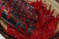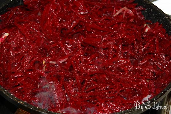 Add the grated beets to the onion and garlic mixture, stirring well.