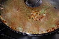 In a frying pan, heat the oil well and cook the julienned onions for a bit.