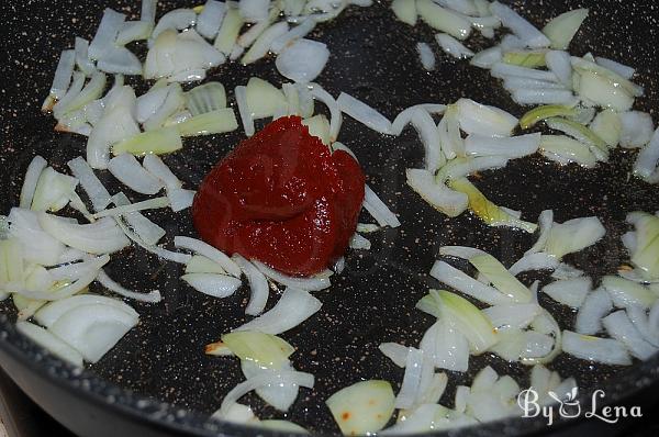 Stir the cabbage with the onions and the tomato paste in the pan.