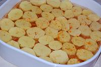 Pour water into the dish, without washing away the spices on the potatoes. Pour slowly between the slices or in the corner of the dish.