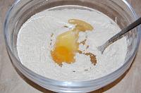 Add in 1 egg and 3 tbsp oil, mix together with the flour using a fork, until the dough is crumbly.