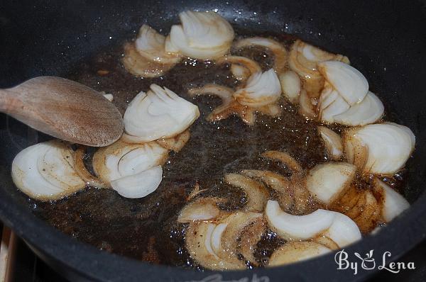 Rest the browned pork temporarily on a plate. Place the finely chopped onion in the pan and cook for 5-7 minutes, stirring periodically.