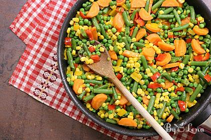 I really like the store-bought combination of Mexican-style vegetables but, for some time now, I prefer not to buy ready-made mixes. I'd rather combine them in the proportions and with the vegetables we like. This way I get the best taste and texture, children eat very well and don't put aside any dubious vegetables from the mix. You can serve these simple Mexican vegetables as a side dish to meat or fish or in combination with rice.