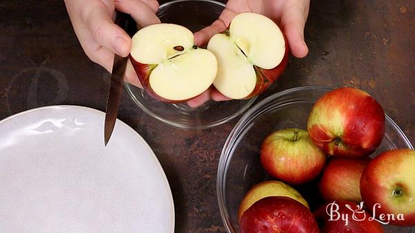 Arrange in a large baking tray, lined with parchment (this is not mandatory, but saves you from washing the tray after baking, as the apples will release the juice).