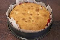 Bake the cherry cake in the preheated oven at 200 degrees C for 40-45 minutes, or until it browns well on top.