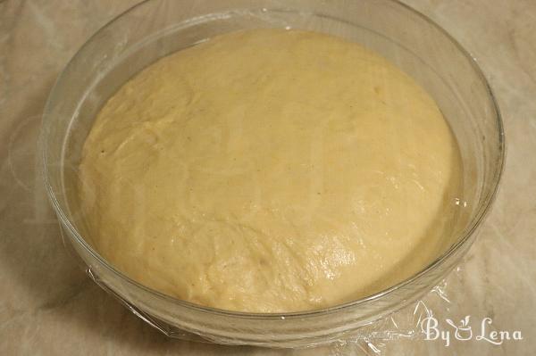 Return the dough back to the bowl, greased with oil. Let rise for 1-2 hours (covered with foil or a towel), until it doubles its volume.