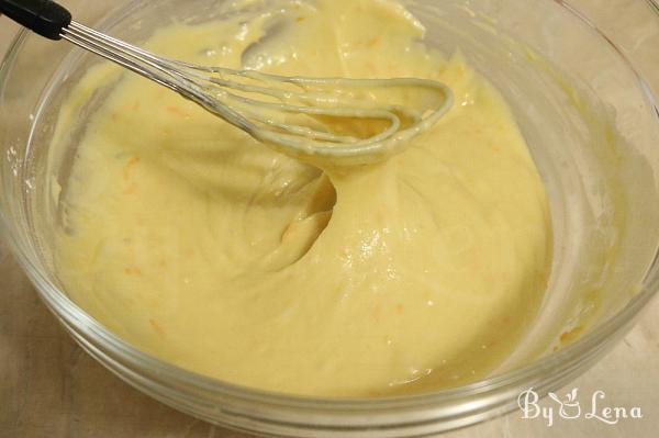 In a larger bowl, combine the orange juice with 80 ml of oil, 150 g of sugar, the grated orange and lemon zest and a quarter of a teaspoon of salt. Mix.