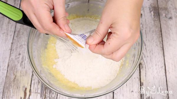 Add 300g flour and 10g baking powder. Mix until smooth.
