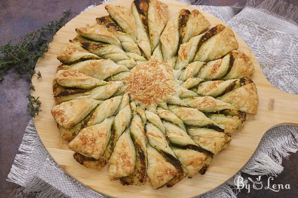 Prepare or purchase the pesto sauce. Red pesto is equally delicious, and you can mix them when spreading on the puff pastry.