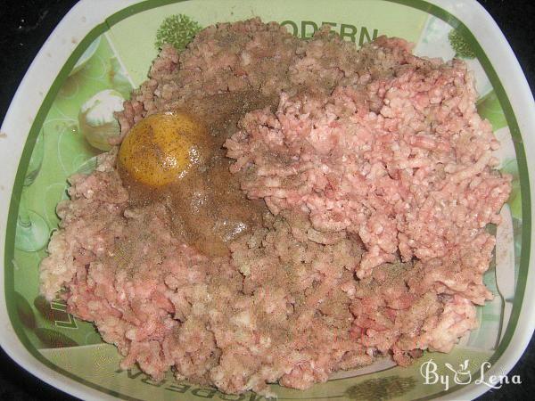 Meanwhile, prepare the filling. Grind the meat together with an onion (if you buy the meat already ground, chop the onion very finely). Add 1 teaspoon of salt, ground black pepper, 2 eggs and mix well.