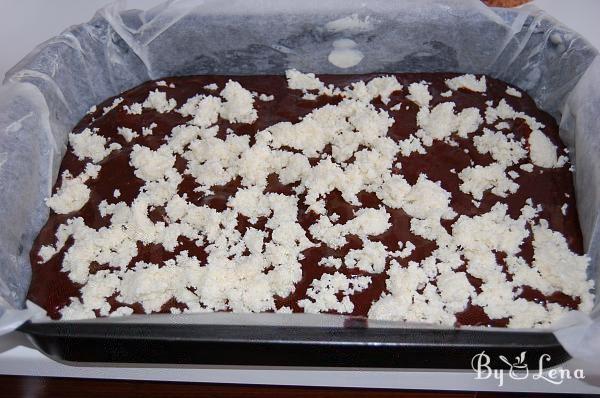 Pour half of the chocolate mixture into the tray, followed by dollops of the coconut mixture. Repeat with the remaining mixtures.