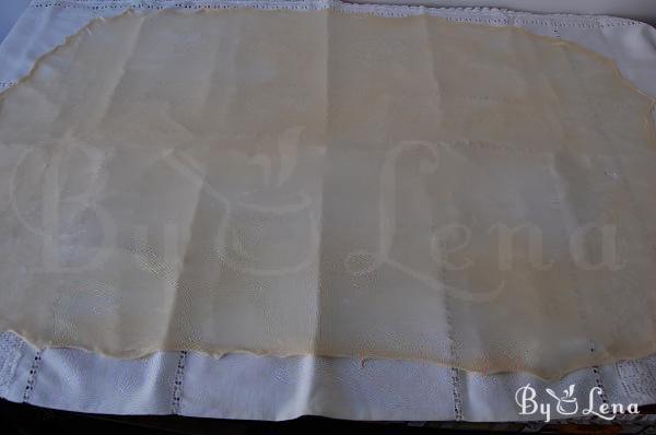 Spread the towel on the kitchen table, take one of the oiled sheets, and spread it lightly. If needed, stretch it slightly with your hands, then place it on the towel and gently pull the edges until it's very thin, and you can see the towel through it, giving it an oval shape, about the size of the table.