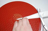 Turn the tray upside down. Place the tip of the stream in the middle of the tray and cut the cornet with scissors exactly where the edge of the tray ends.
