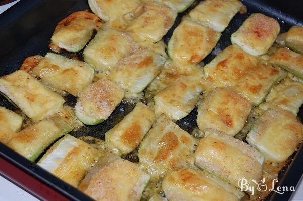 Put a thin slice of cheese on each piece of zucchini - or you can grate it.