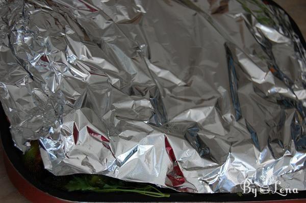 Cover the pan with foil and place in a preheated oven at 200 degrees - for about 1.30 -2 hours.