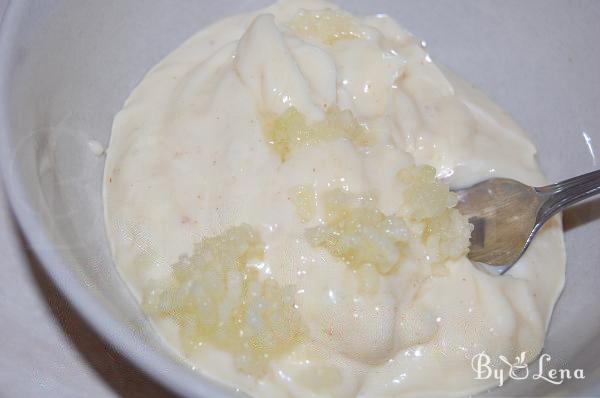 Then grate the tomatoes and spread them evenly over the mayonnaise.