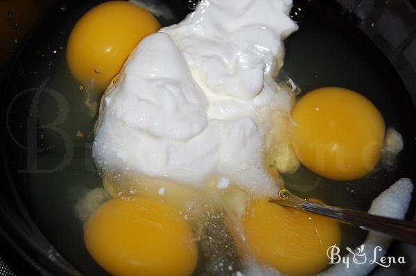 In a smaller bowl, whisk together the eggs, sour cream, a pinch of salt, and pepper.