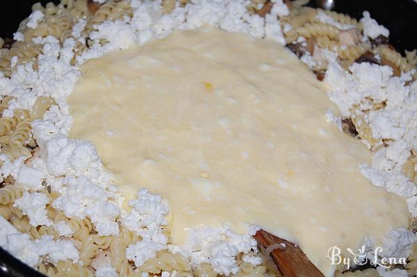 In the pasta bowl, add finely crumbled Feta cheese using your hands or a fork.