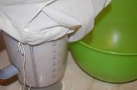 Pour the blender contents into the bag, positioned over the bowl to collect the milk.